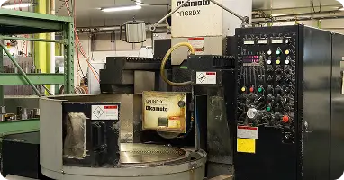 A rotary surface grinder with a unique gate-type structure whose original controller achieved 0.1µm infeed setting